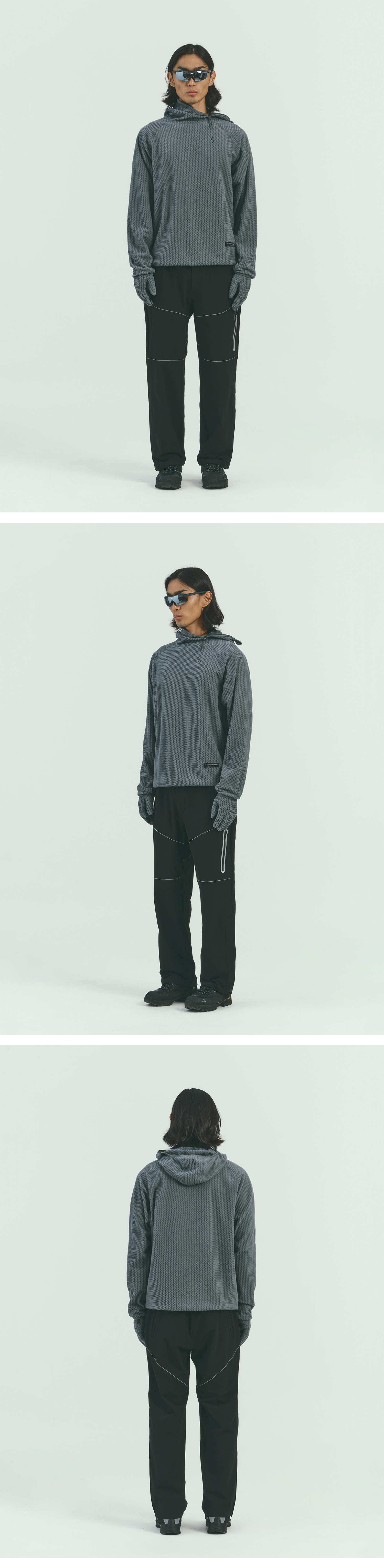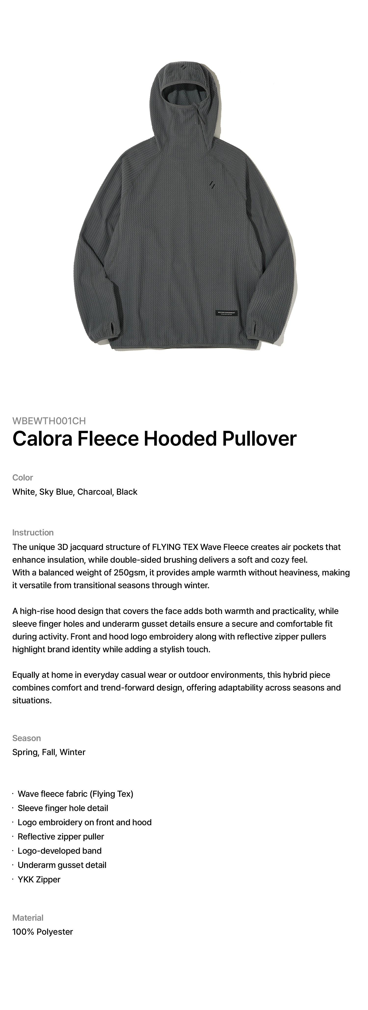 A high-rise hood design that covers the face adds both warmth and practicality, while sleeve finger holes and underarm gusset details ensure a secure and comfortable fit during activity.