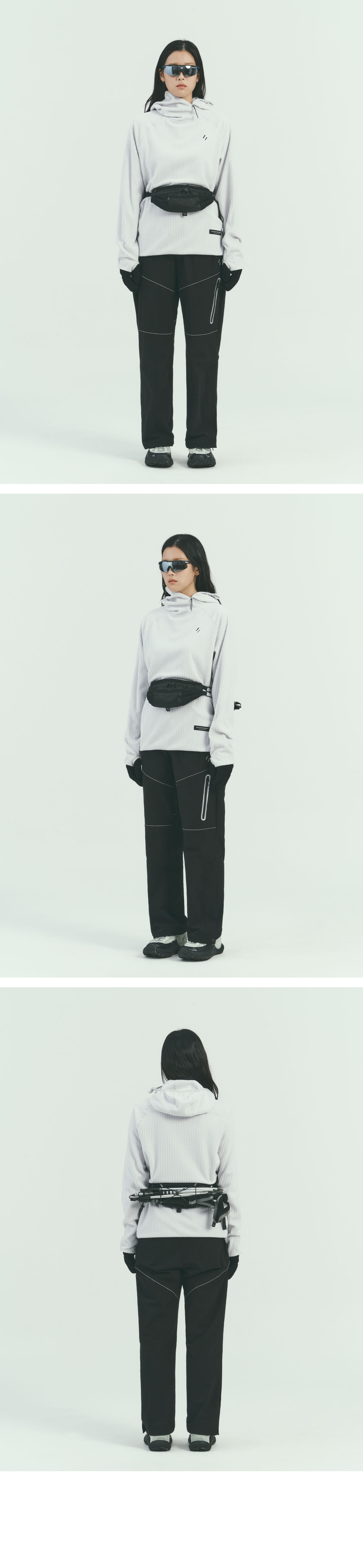 A high-rise hood design that covers the face adds both warmth and practicality, while sleeve finger holes and underarm gusset details ensure a secure and comfortable fit during activity.