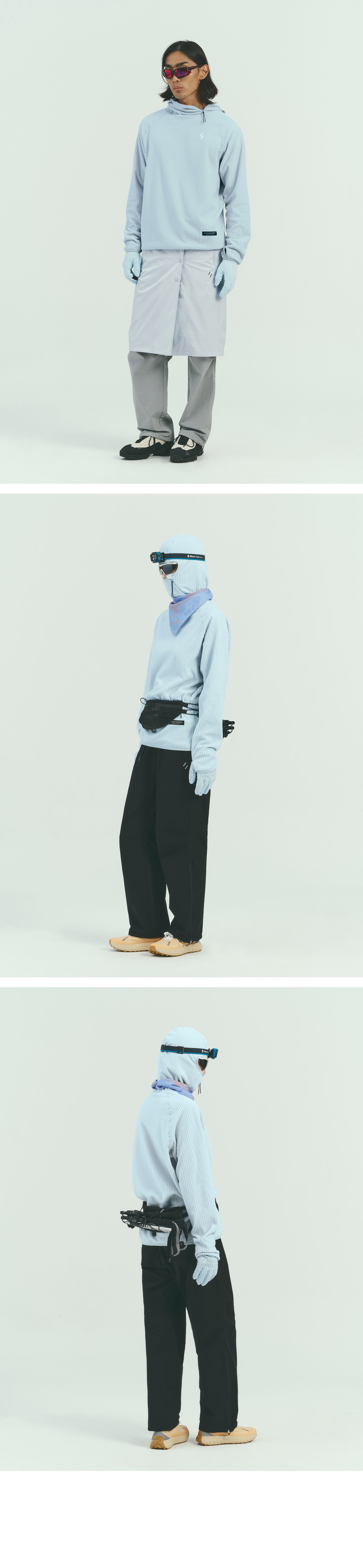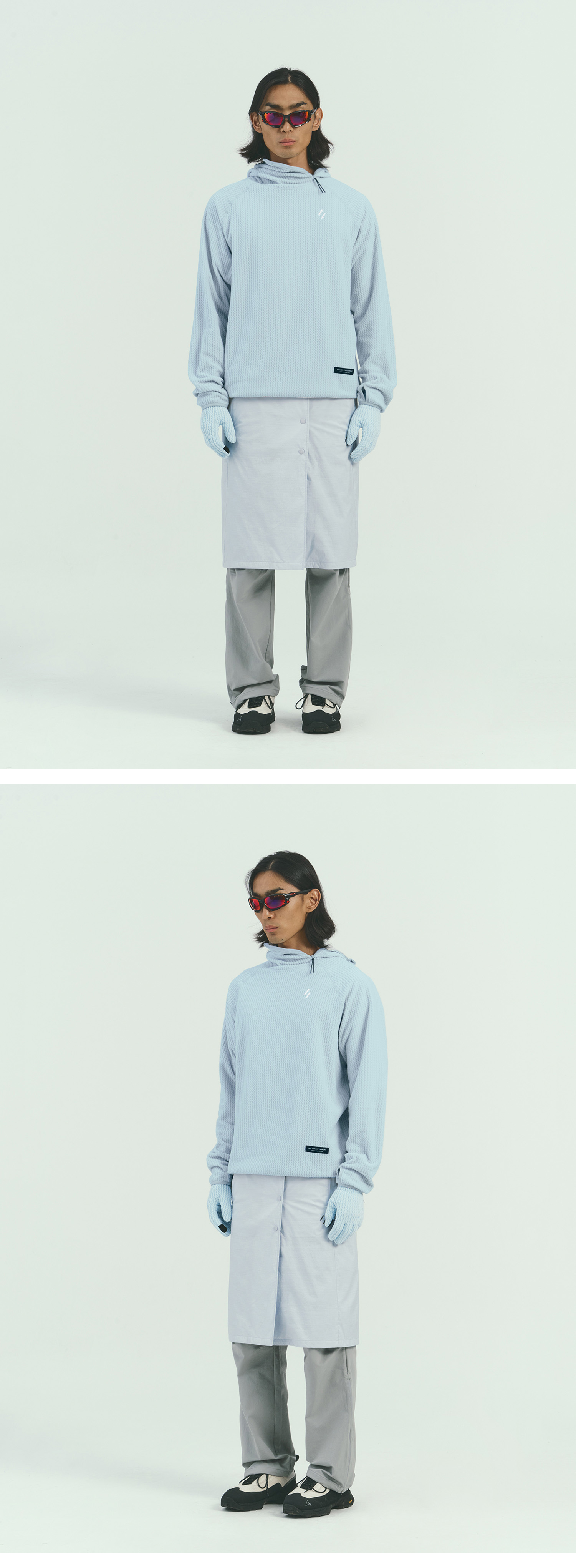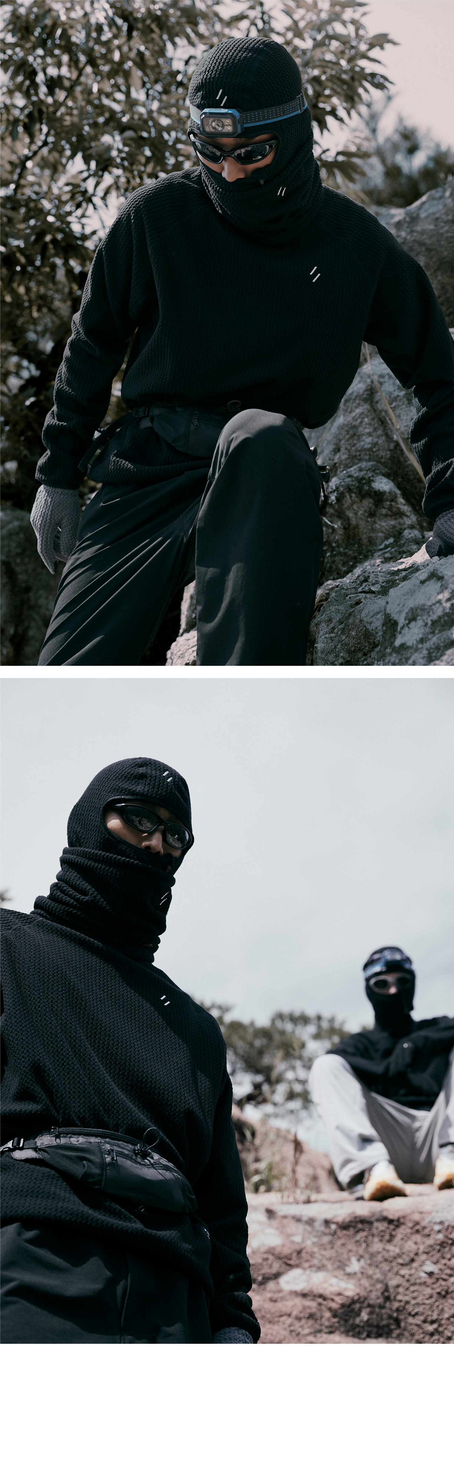 A high-rise hood design that covers the face adds both warmth and practicality, while sleeve finger holes and underarm gusset details ensure a secure and comfortable fit during activity.