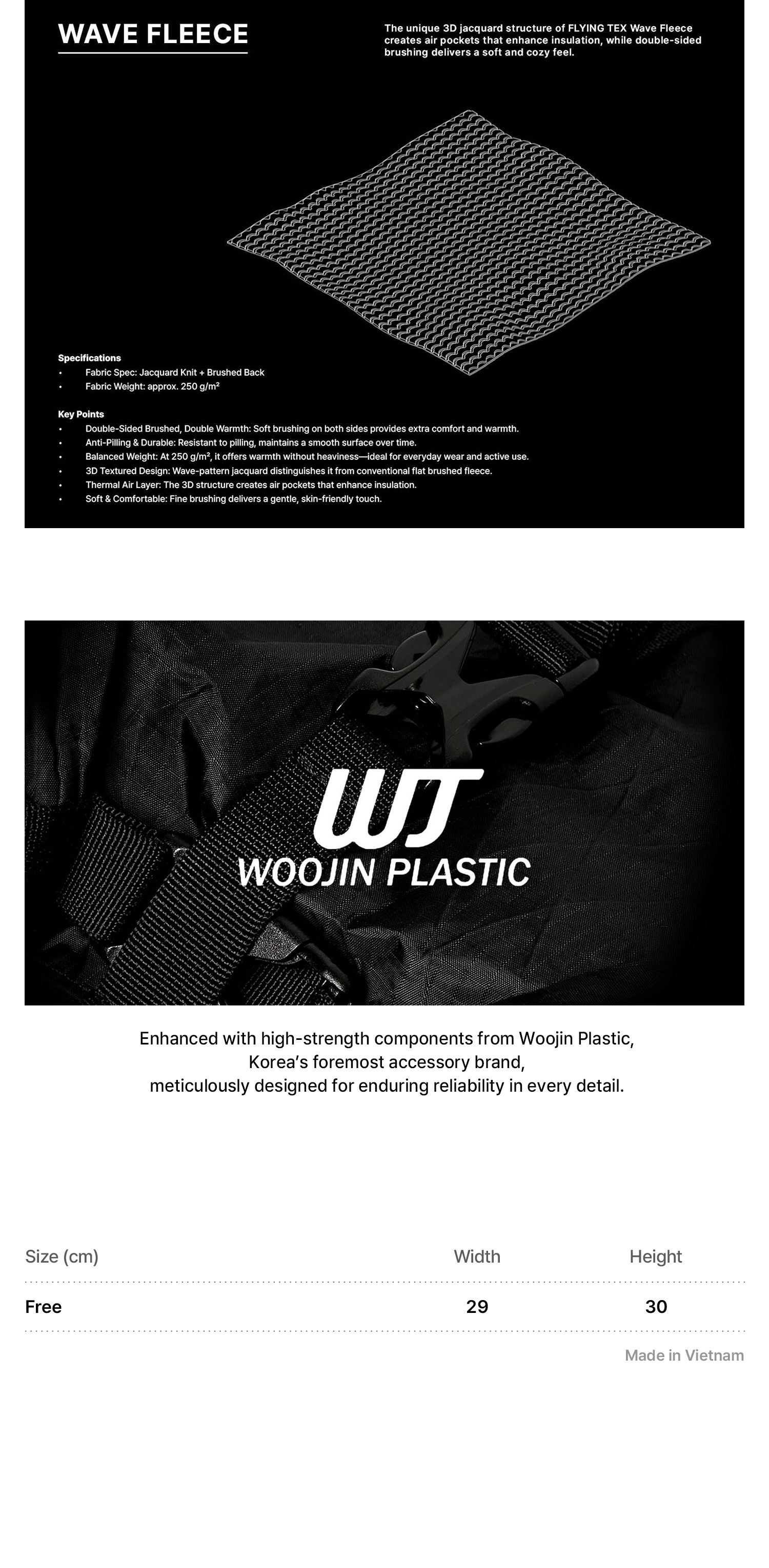 'The unique 3D jacquard structure of FLYING TEX Wave Fleece creates air pockets for excellent insulation, while double-sided brushing delivers a soft and cozy feel.