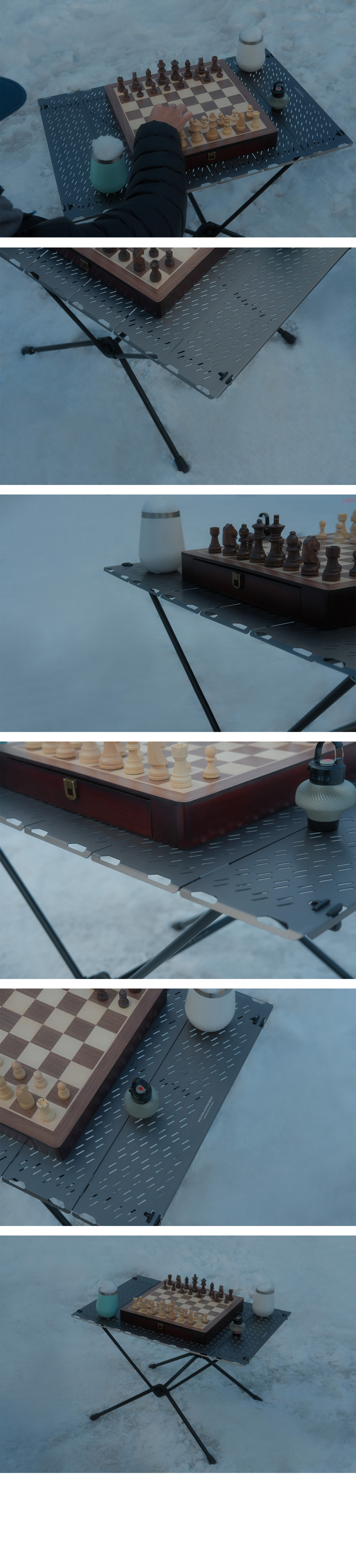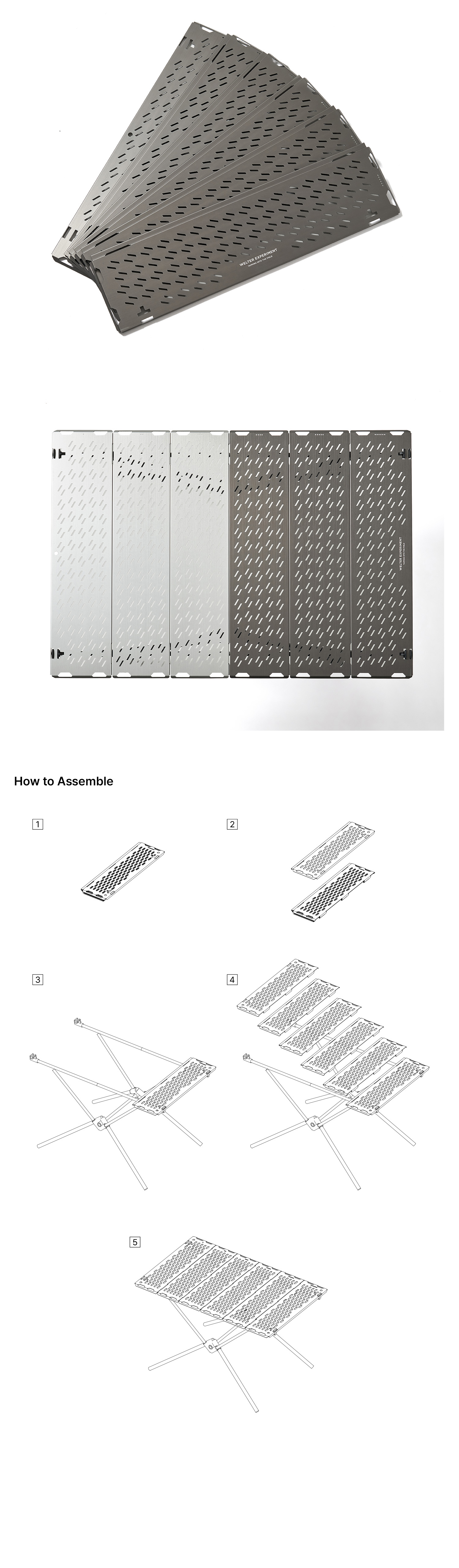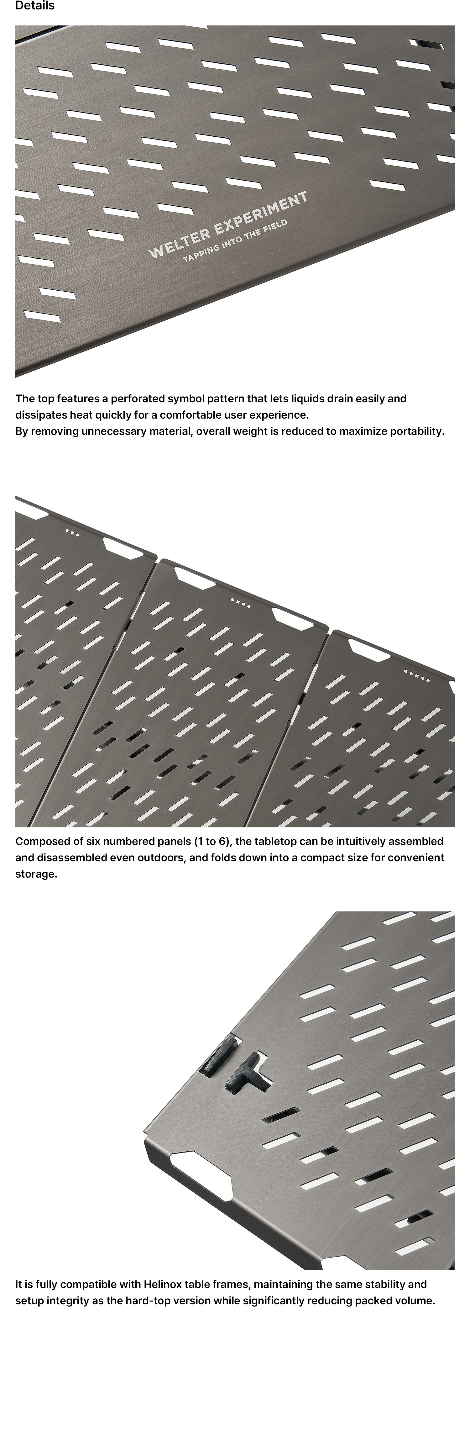 Composed of six numbered panels (1 to 6), the tabletop can be intuitively assembled and disassembled even outdoors, and folds down into a compact size for convenient storage.