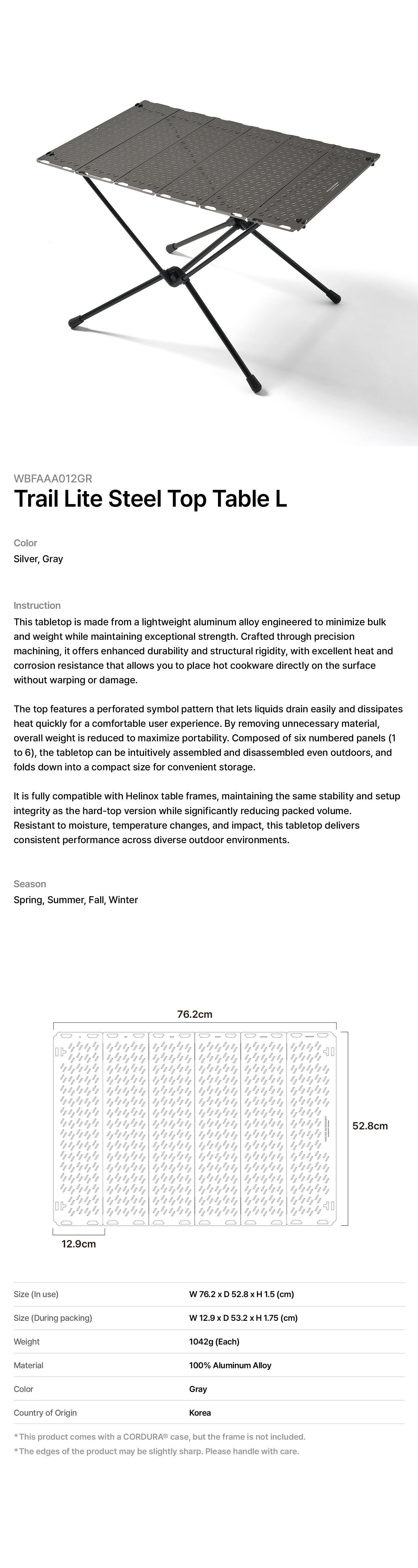 It is fully compatible with Helinox table frames, maintaining the same stability and setup integrity as the hard-top version while significantly reducing packed volume.