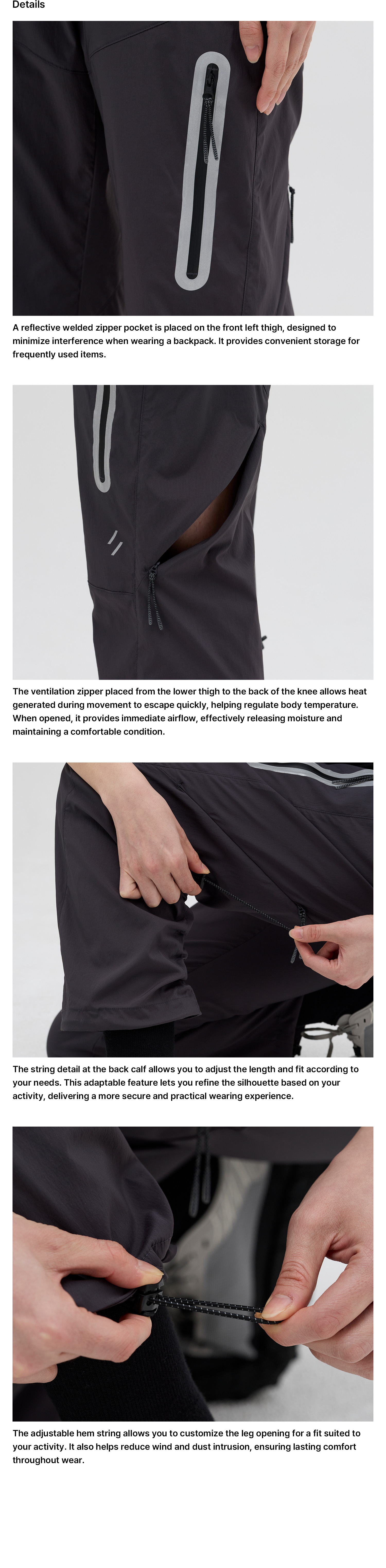 Drawstrings at the hem allow both width and length adjustment for versatile styling, and reflective details increase visibility during nighttime activities.